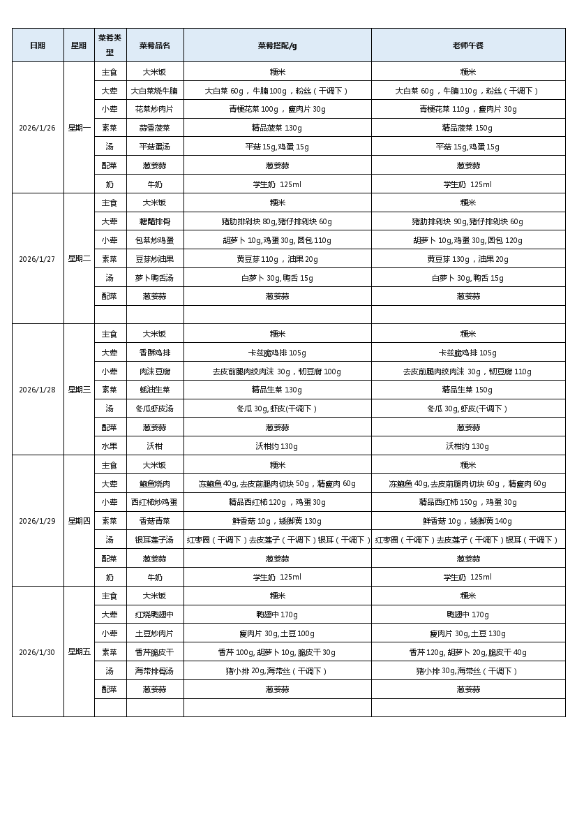 汇通路小学2025-2026学年度第一学期第22周菜谱
