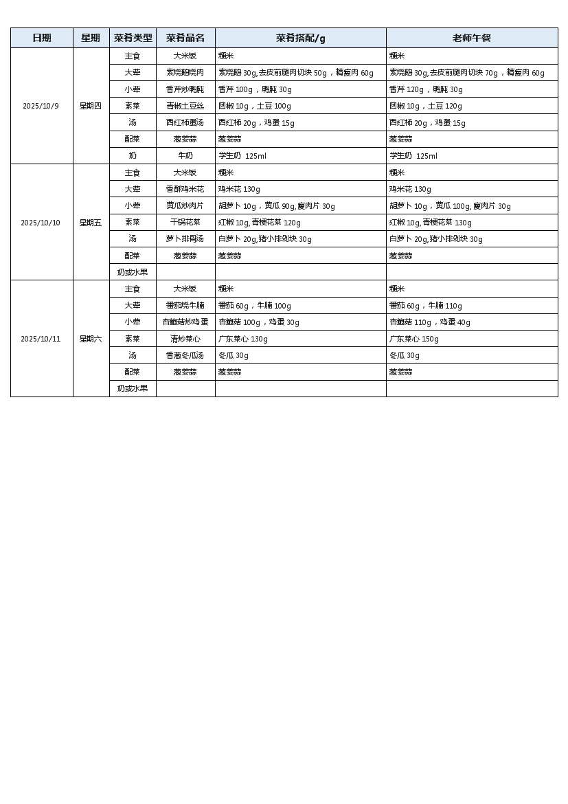 汇通路小学2025-2026学年度第一学期第6周菜谱