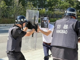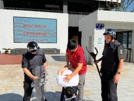 与此同时,学校训练有素的专职安保队伍与值班护校教师组成的应急处置小组闻令而动。队员们身着防护装备,手持防暴盾牌、钢叉、警棍等专业器械,火速奔赴事发地点。面对“歹徒”的挑衅与冲击,队员们沉着冷静,利用娴熟的战术配合,迅速形成合围之势,通过有效的格挡、控制与擒拿技术,在短时间内成功将“歹徒”制服并带离现场,有效控制了事态恶化。