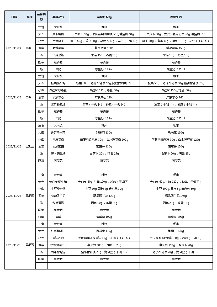 汇通路小学2025-2026学年度第一学期第13周菜谱