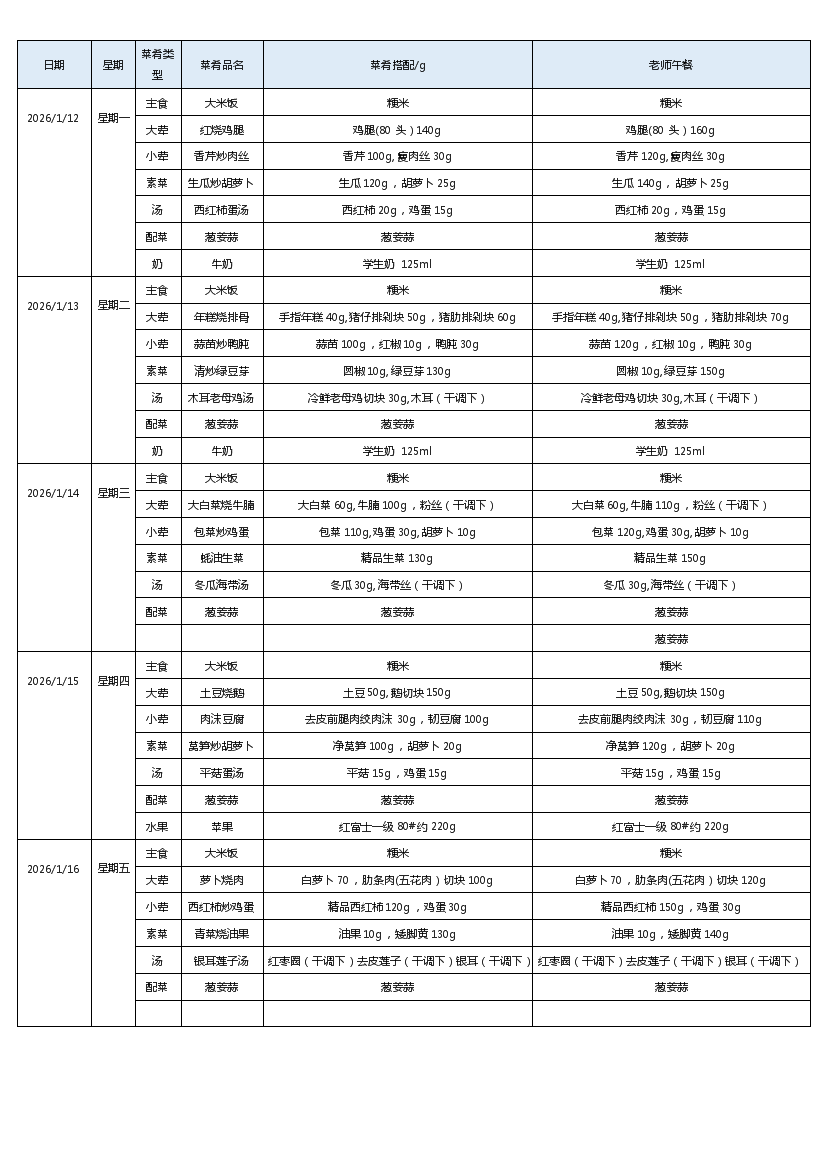 汇通路小学2025-2026学年度第一学期第20周菜谱